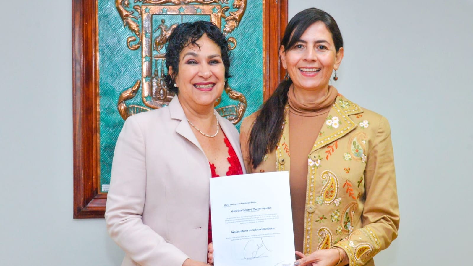 Morelia, Michoacán, 21 de diciembre del 2022.- María del Carmen Escobedo Pérez recibió este miércoles su nombramiento como subsecretaria de Educación Básica, de manos de la titular de la Secretaría de Educación del Estado (SEE), Gabriela Molina Aguilar.