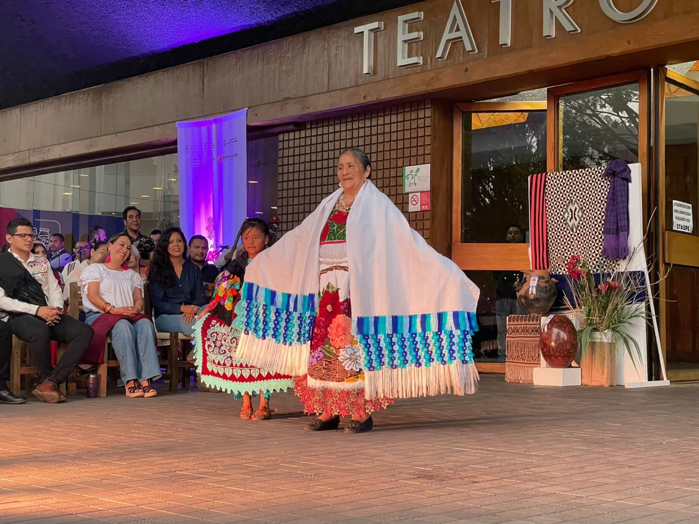Morelia, Michoacán, 12 de mayo de 2023.- Artesanas y artesanos michoacanos cautivaron con sus textiles al público asistente a la pasarela Joparani, que se realizó en la explanada del Teatro Morelos, en el marco del Festival Michoacán de Origen.