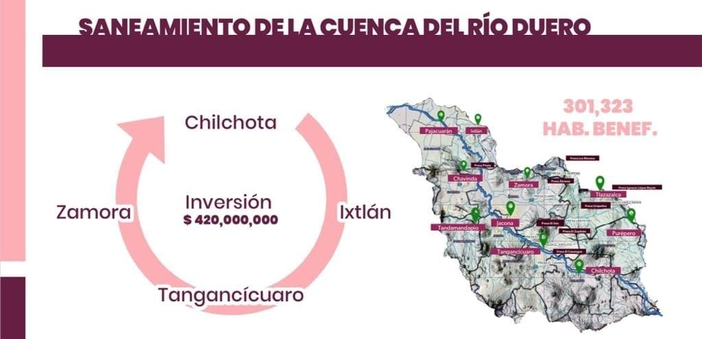 El programa de infraestructura contempla que, en los municipios de Chilchota, Tangancícuaro e Ixtlán, se lleve a cabo la construcción de colectores de dimensiones de 1.4, 1.8 y 4.25 kilómetros, respectivamente, para un total de 7.45 kilómetros por la cuenca del río Duero.
