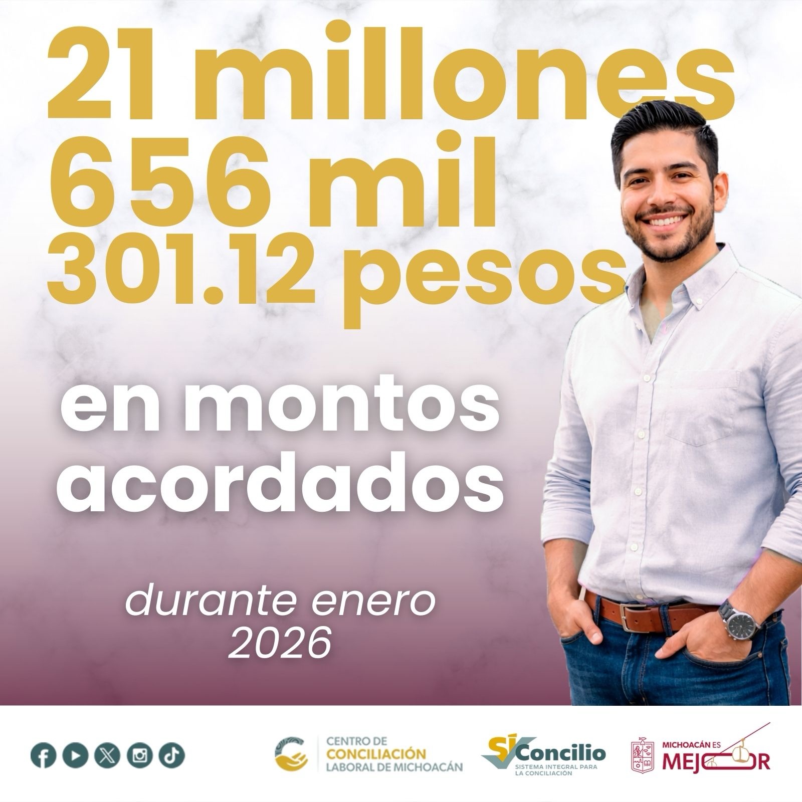 El Centro de Conciliación Laboral de Michoacán (CCL) informó que, durante el primer mes de 2026, se concretaron acuerdos económicos entre trabajadores y empleadores por un total de 21 millones 656 mil 301 pesos. Estos recursos derivan de convenios celebrados mediante mecanismos de diálogo y mediación contemplados en el modelo de justicia laboral.
