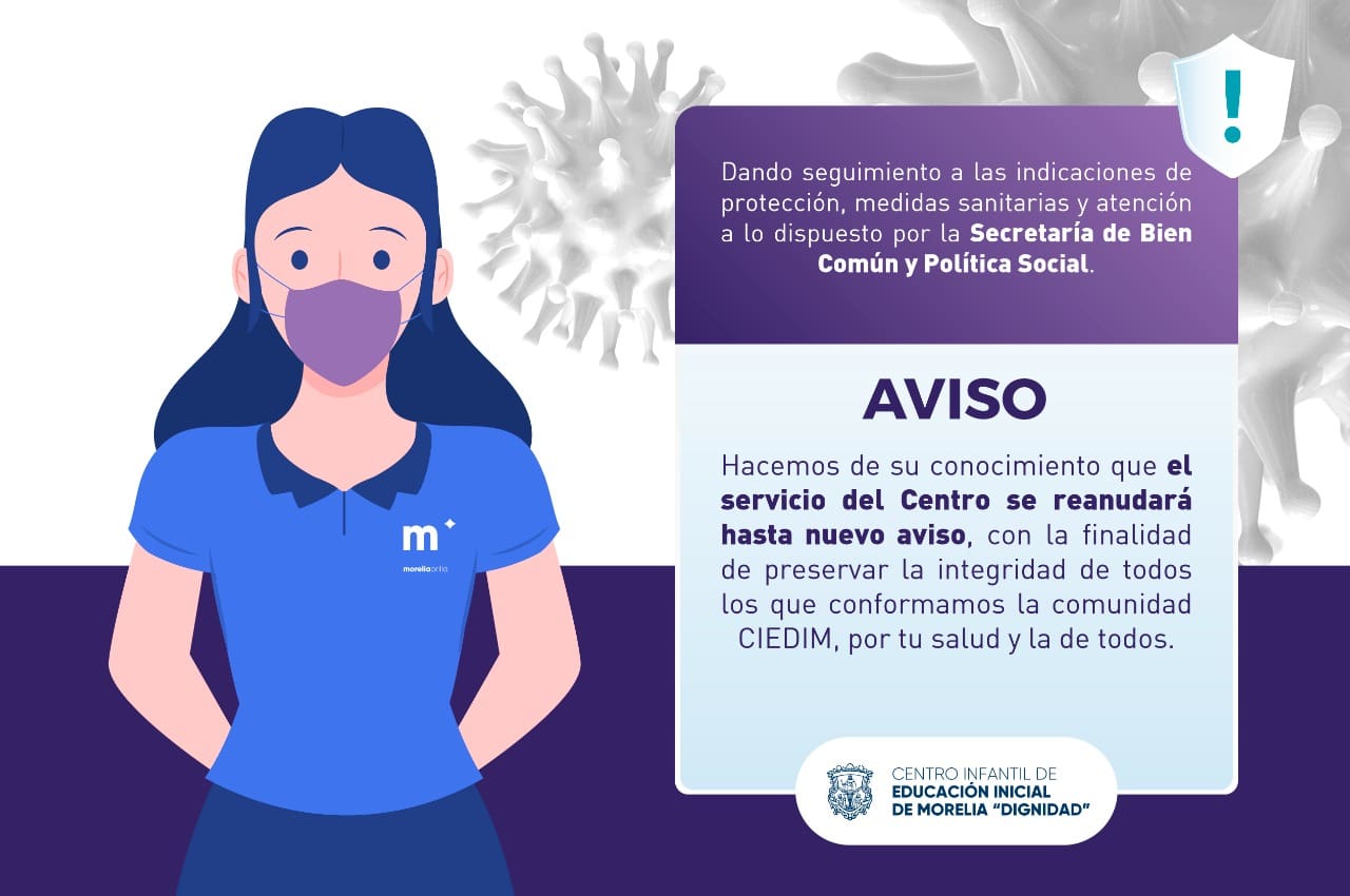 Morelia, Michoacán, 12 de enero del 2022.-En seguimiento a las indicaciones de protección, medidas sanitarias y atención a lo dispuesto por la Secretaría de Bien Común y Política Social, el Centro de Educación Inicial de Morelia “Dignidad”, reanudará sus servicios hasta nuevo aviso.