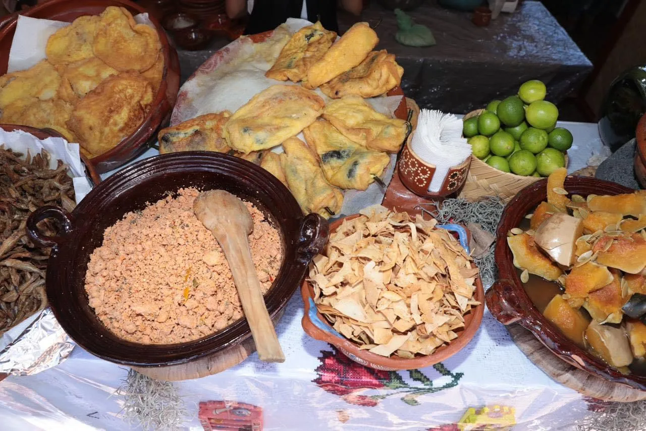 Tzintzuntzan, Michoacán, 14 de marzo de 2024.- Churipo con corundas, pescado dorado, atole de pinole, pozole batido, buñuelos, hongos, caldo de trucha, mole, tamales de trigo, tacos y quesadillas de diversos guisados, serán parte de los platillos que los asistentes a la K’uínchekua podrán degustar.