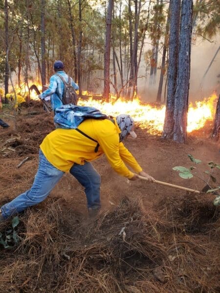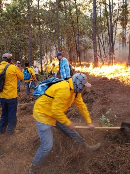 El Centro Estatal del Manejo del Fuego, de la Comisión Forestal, informó que las brigadas realizan operativos terrestres alrededor del perímetro donde se mantienen activas las llamas para evitar la propagación del fuego en zonas vulnerables.