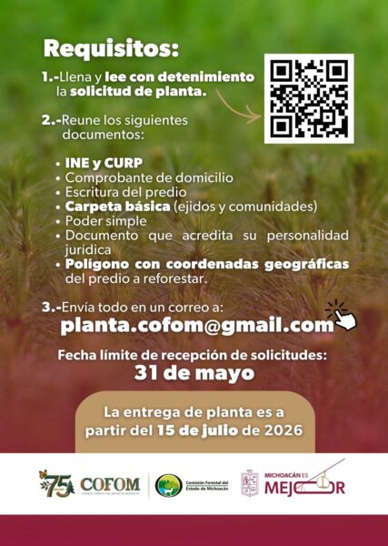 La Comisión Forestal de Michoacán (Cofom) inició el proceso de recepción de solicitudes para la donación de plantas destinadas a la restauración de suelos forestales. La dependencia informó que el periodo para realizar el trámite permanecerá abierto desde ahora y hasta el domingo 31 de mayo de 2026.