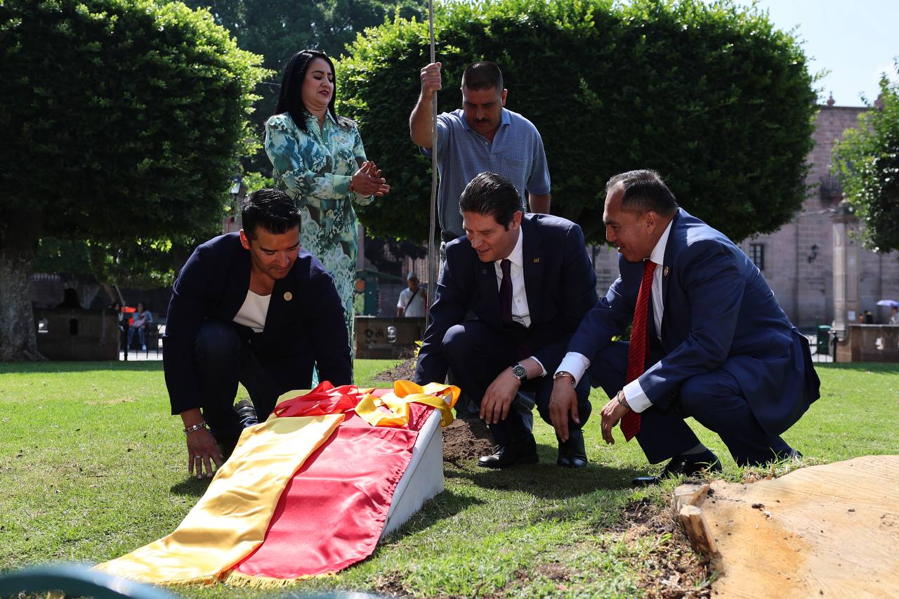 Morelia, Michoacán; 18 de mayo del 2023.- Como un acto simbólico que sirva para recordar la historia de Morelia y abrir una ventana al legado y patrimonio de la ciudad, el Presidente Municipal, Alfonso Martínez Alcázar, encabezó la plantación de un árbol y la colocación de una cápsula del tiempo en la Plaza de Armas, en el marco de la celebración de los 482 años de la capital.