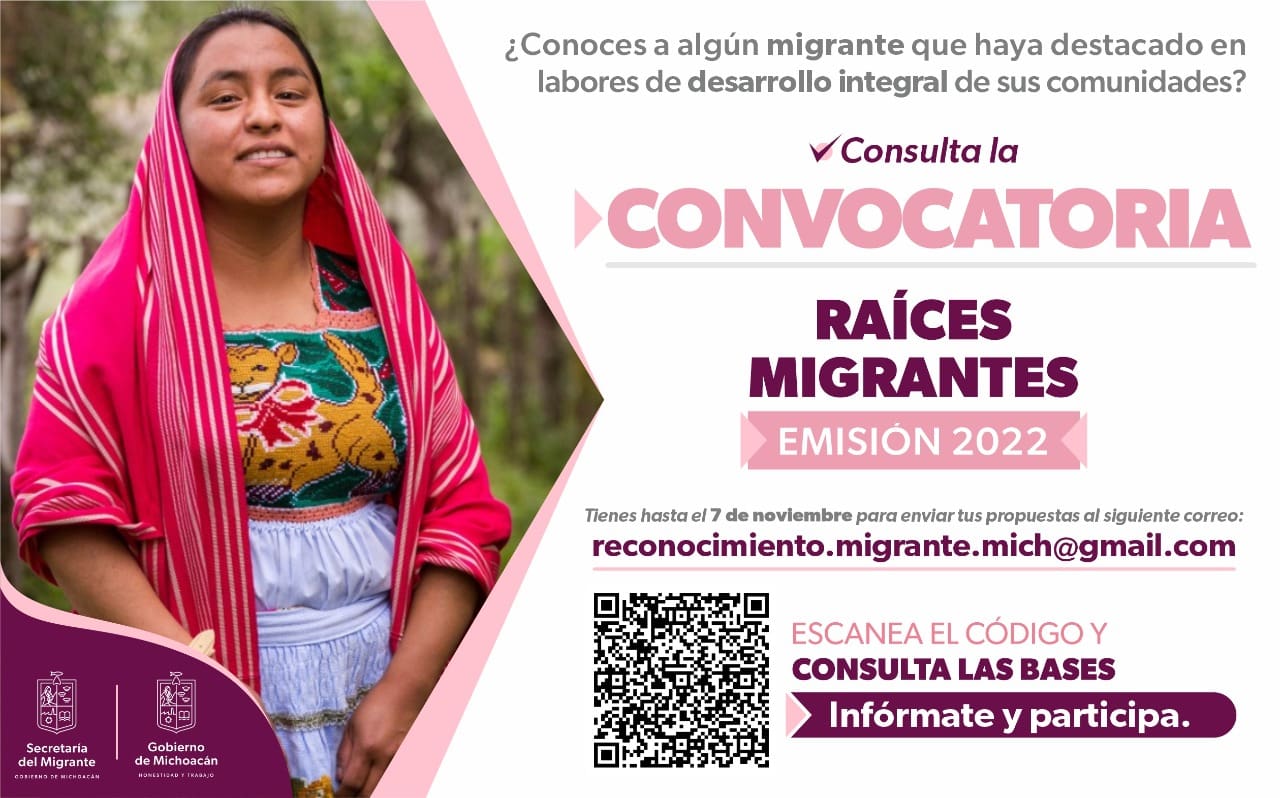 Brenda Fraga expuso que la convocatoria para brindar el Reconocimiento a la Labor de las Personas Migrantes en el Estado de Michoacán “Raíces Migrantes 2022” continúa abierta para recibir propuestas de universidades e instituciones de educación superior, institutos y centros de investigación, academias, asociaciones culturales, civiles y de profesionistas, organizaciones de migrantes, sociedades cooperativas, dependencias y entidades de la administración pública municipal o estatal y entidades de autogobierno del territorio michoacano, para que propongan a una mujer y un hombre para recibir este reconocimiento en cualquier ámbito del desarrollo integral.