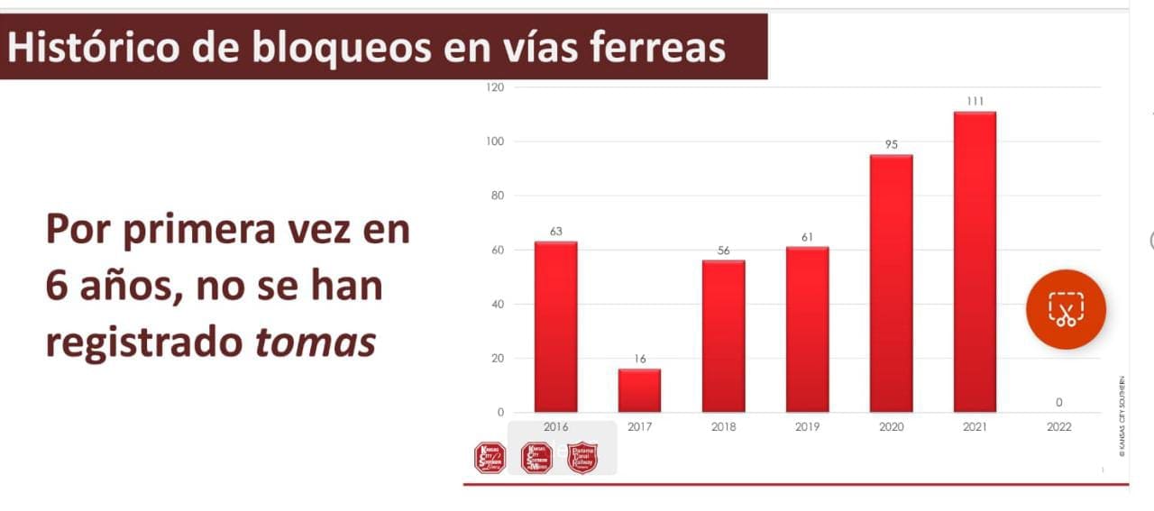 Resaltó que Kansas City Southern, proporcionó estadísticas del tránsito ferrovial el cual arrojó que por primera vez en seis años, no se han registrado tomas.