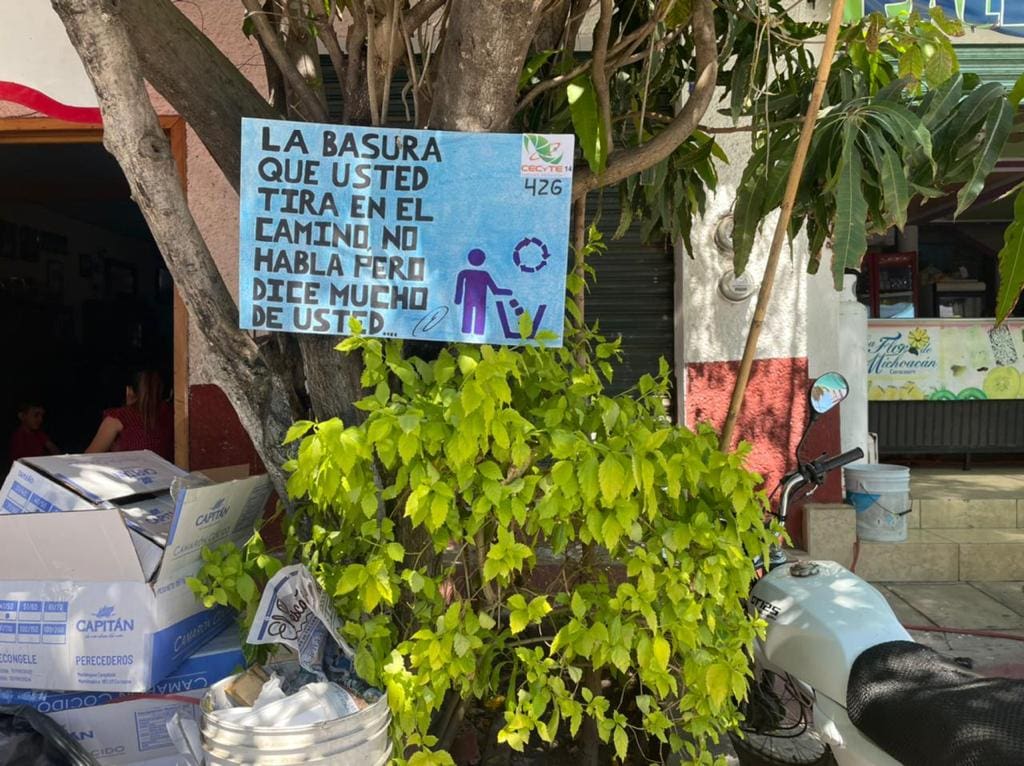 Carácuaro, Michoacán, 19 de febrero de 2023.- Alumnos del plantel 14 Carácuaro del Colegio de Estudios Científicos y Tecnológicos del Estado de Michoacán (Cecytem), realizaron una campaña de concientización de limpieza dirigida a los visitantes de la Fiesta de Ceniza.