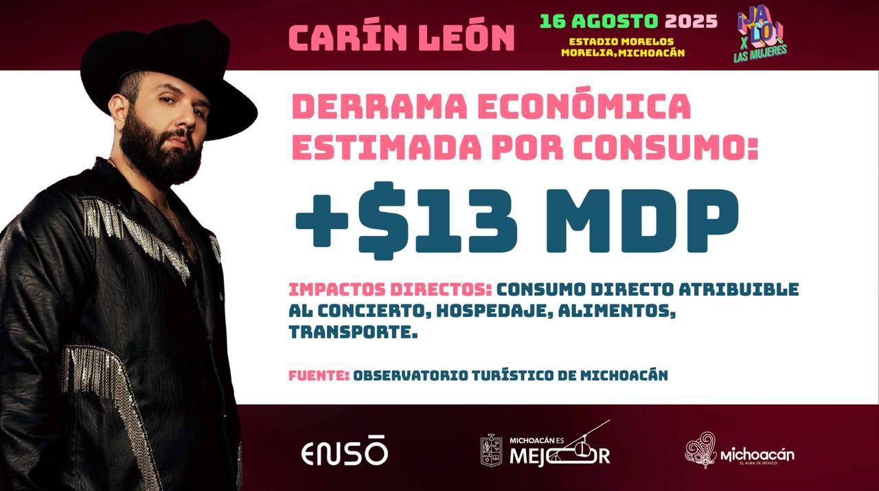 Morelia, Michoacán – El gobernador Alfredo Ramírez Bedolla anunció que el concierto del cantante Carín León producirá una derrama económica que superará los 13 millones de pesos en la capital michoacana, principalmente a través de gastos en hospedaje, alimentos y transporte.