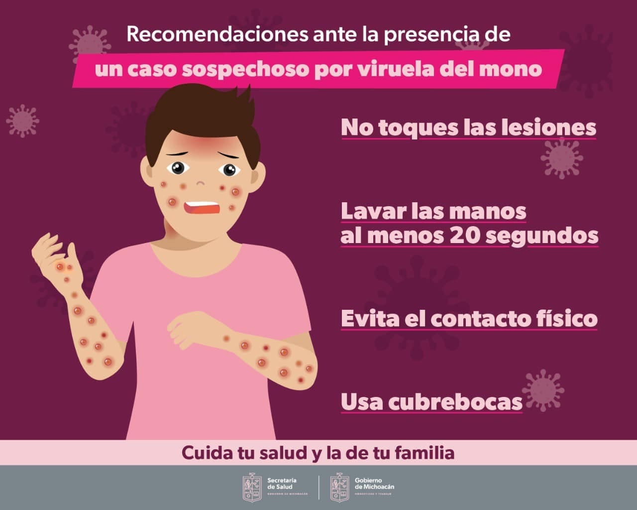 Ante la presencia de síntomas por probable viruela del mono, evitar tocar las lesiones, lavar las manos por al menos 20 segundos, evitar el contacto físico con las demás personas para no contagiarlas y utilizar cubrebocas.