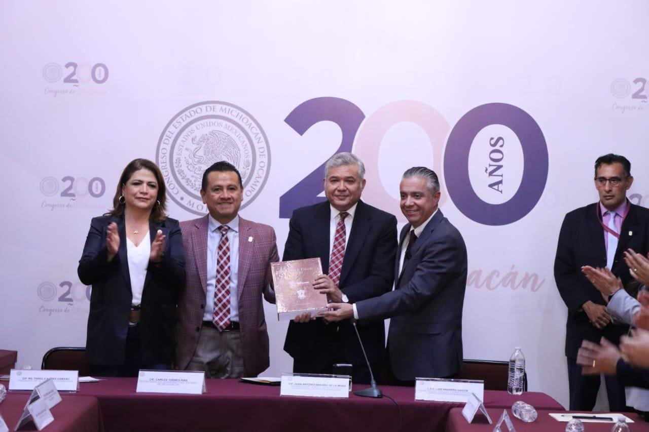 Morelia, Mich., 21 de noviembre de 2024. El Congreso del Estado de Michoacán ha recibido formalmente el Paquete Económico para el Ejercicio Fiscal 2025, presentado por el titular de la Secretaría de Finanzas y Administración, Luis Navarro García. El documento, con un presupuesto propuesto de 98 mil 930 millones de pesos, será evaluado por las Comisiones Unidas de Programación, Presupuesto y Cuenta Pública, y de Hacienda y Deuda Pública.