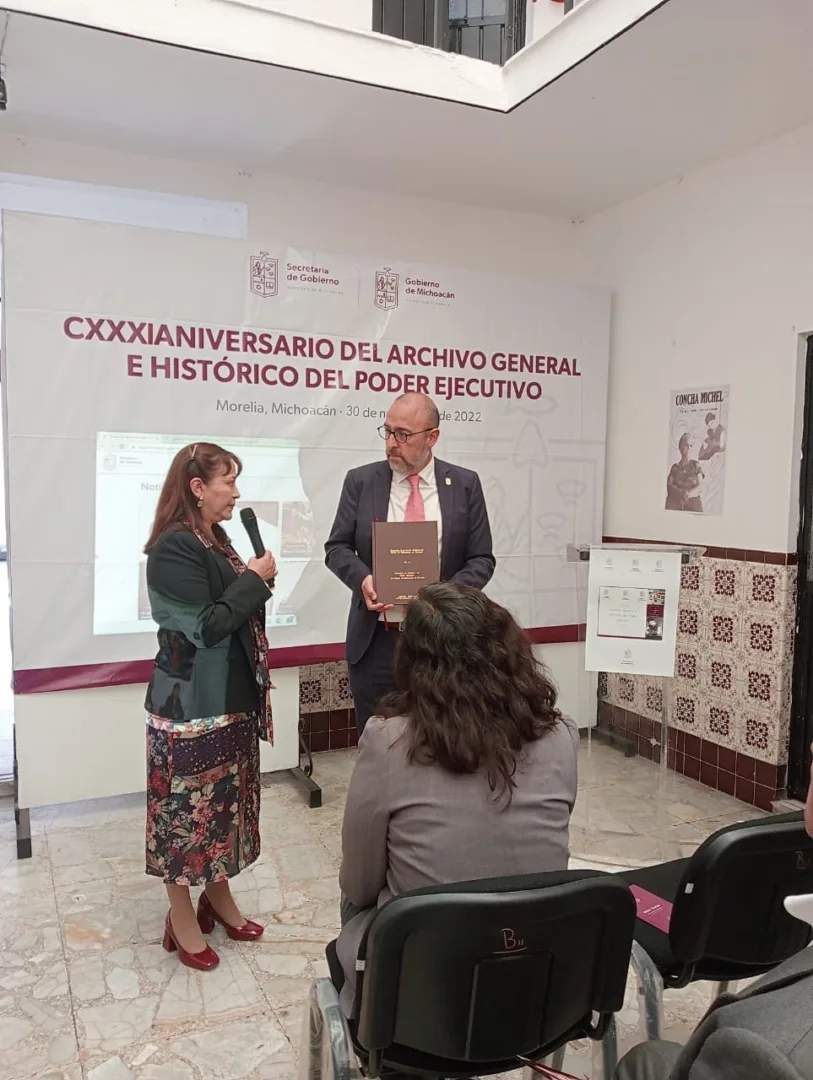 Morelia, Michoacán, 1 de diciembre de 2022.- La Secretaría de Gobierno a través de la Dirección de Archivos del Poder Ejecutivo conmemora el 131 Aniversario del Archivo General e Histórico del Poder Ejecutivo con la entrega de la propuesta de la Ley de Archivos del Estado de Michoacán.