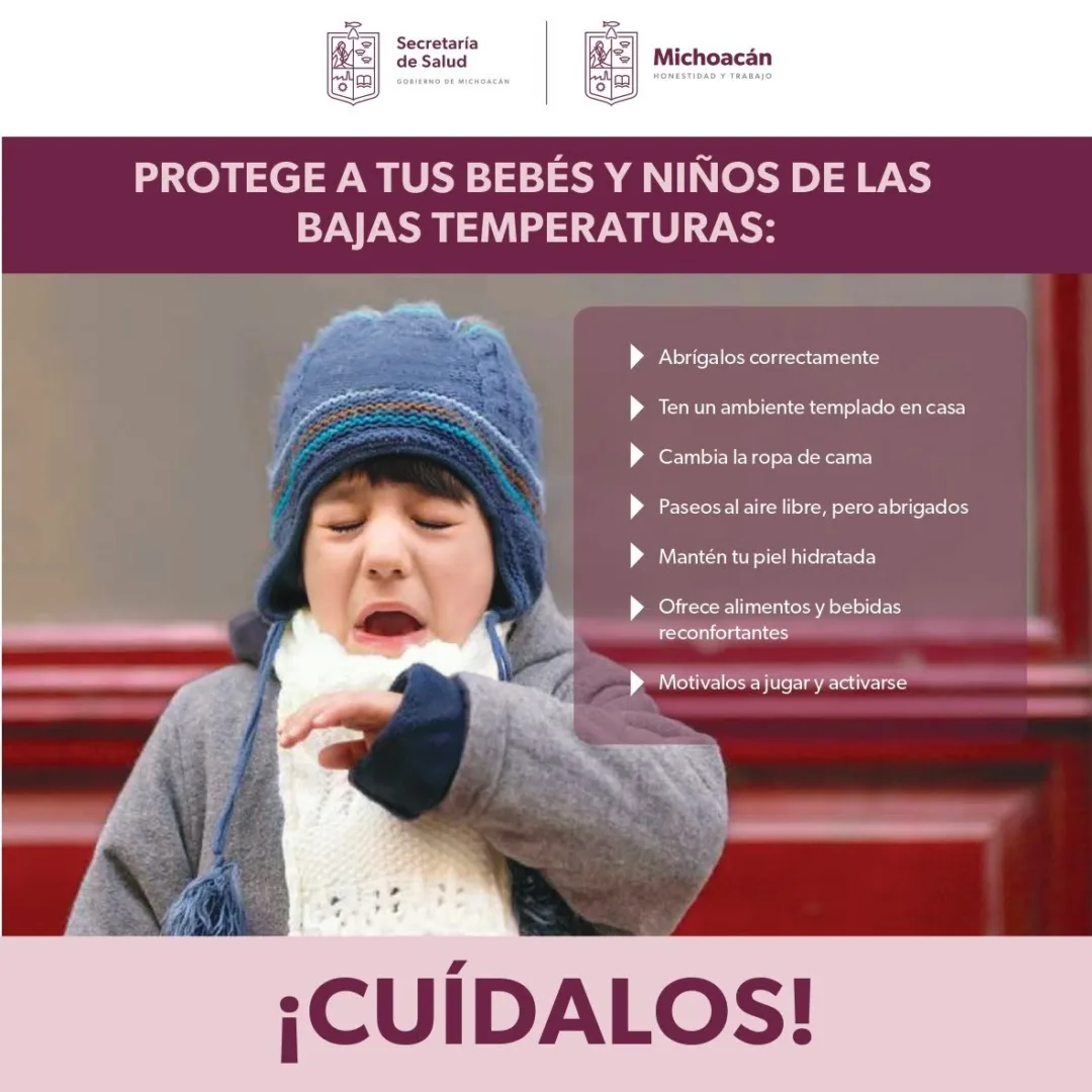 Morelia, Michoacán, 22 de enero del 2023.- De acuerdo al reporte meteorológico nacional emitido por el Gobierno Federal, derivado del frente frío número 26, Michoacán alcanzará temperaturas mínimas de 0 a 5°C con posibles heladas, por ello, la Secretaría de Salud de Michoacán (SSM) exhorta a la población a extremar precauciones para el cuidado de su salud.