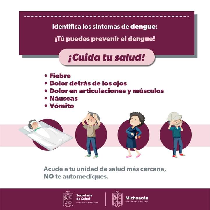 Morelia, Michoacán, 18 de noviembre de 2023.- Dolor intenso de cabeza, articulaciones, músculos y ojos; así como fiebre mayor a los 38 grados, junto con náuseas y sarpullido, son algunos de los síntomas del dengue, enfermedad provocada por la picadura del mosquito Aedes aegypti, y cuyo tratamiento es gratuito a toda la población sin seguridad social en los 364 centros de la Secretaría de Salud de Michoacán (SSM).