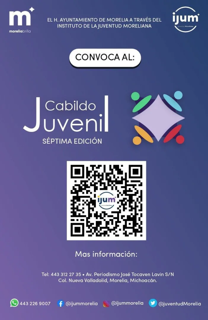 Morelia, Michoacán; a 28 de julio de 2023.- El Instituto de la Juventud Moreliana (IJUM) recuerda a las y los jóvenes que continúa abierta la convocatoria para participar en la séptima edición del Cabildo Juvenil 2023, por lo que les invita a realizar su registro lo antes posible ya que esta cerrará el próximo 6 de julio.