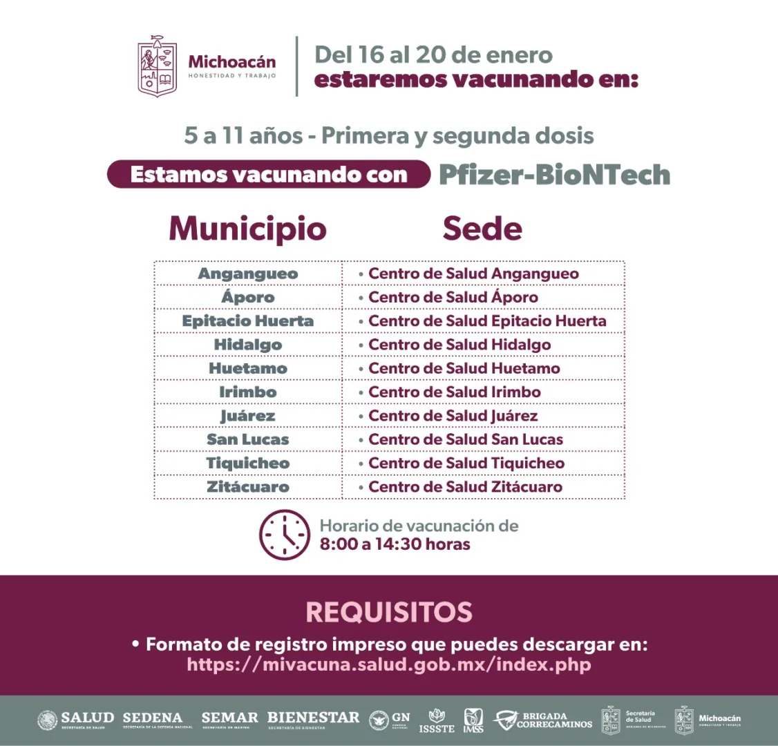 Las sedes ya están anunciadas en la página de la Secretaría de Salud de Michoacán (SSM) y el formato de registro puede hacerse a través del enlace https://mivacuna.salud.gob.mx.