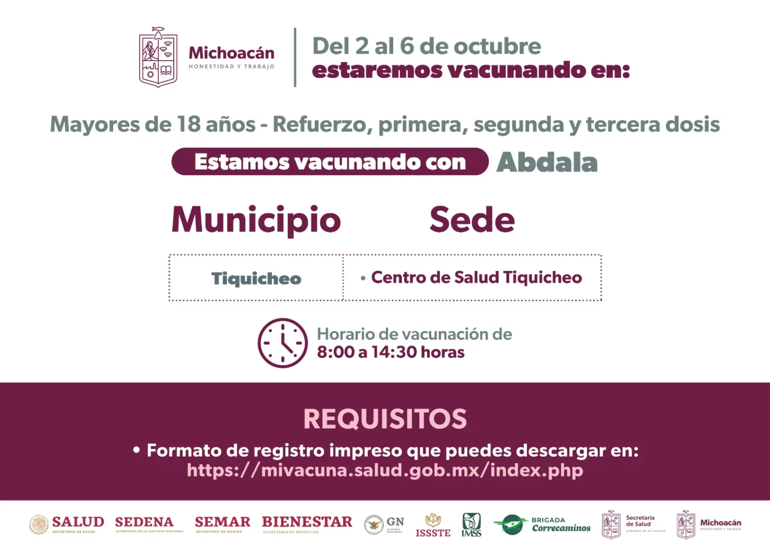 Es así que del 2 al 31 de octubre se instalarán diversos puestos de vacunación en los municipios de Aguililla, Apatzingán, Coalcomán, Tepalcatepec, Jacona, Zamora, La Piedad, Acuitzio, Ario y Carácuaro.