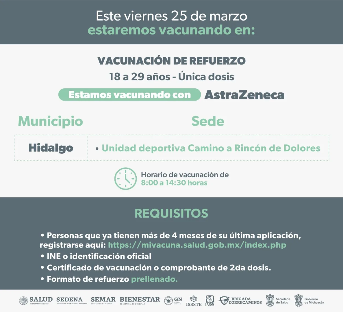 La atención se brindará de 8:00 a 15:00 horas en Unidad Deportiva camino a Rincón de Dolores en Hidalgo y Plaza Principal de Comachuén, las personas que acudan deberán presentarse con su identificación oficial; certificado de vacunación o comprobante de aplicación de segunda dosis y su formato de refuerzo prellenado.