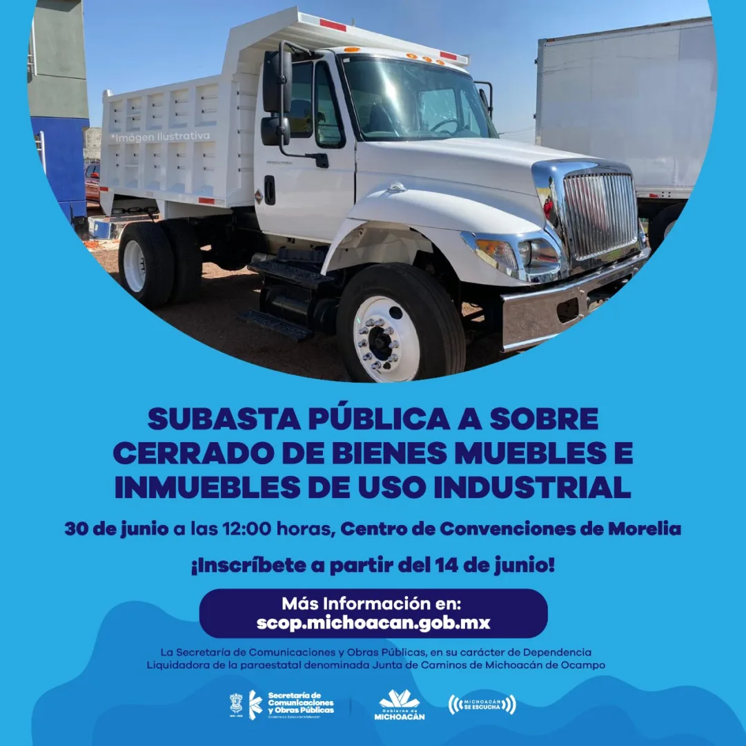 Morelia, Michoacán, 18 de junio de 2021.- El Gobierno de Michoacán, a través de la Secretaría de Comunicaciones y Obras Públicas (SCOP), convoca a la subasta número SCOP/003/2021 para la enajenación de bienes muebles e inmuebles propiedad de la Junta de Caminos, en liquidación, que se desarrollará el miércoles 30 de junio de 2021, a las 12:00 horas, en el Centro de Convenciones y Exposiciones (Ceconexpo) de Morelia.