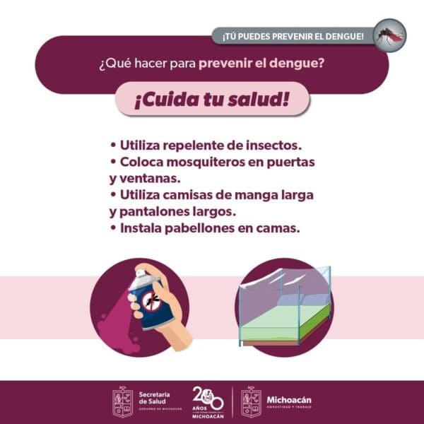 Morelia, Michoacán, 26 de junio de 2024.- La Secretaría de Salud de Michoacán (SSM) exhorta a la población a no bajar la guardia en la lucha contra el dengue, al implementar medidas preventivas en los hogares y solicitar atención de emergencia en caso de presentar signos de alarma de la enfermedad.