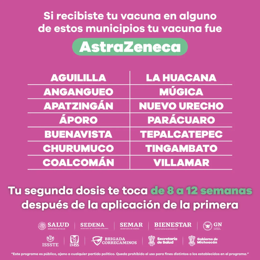 Morelia, Michoacán, a 18 de abril de 2021.- El Consejo Estatal de Vacunación (Coeva) informa que la vacuna AstraZeneca, cuenta con un intervalo de aplicación de 84 días para completar el esquema de inmunización.