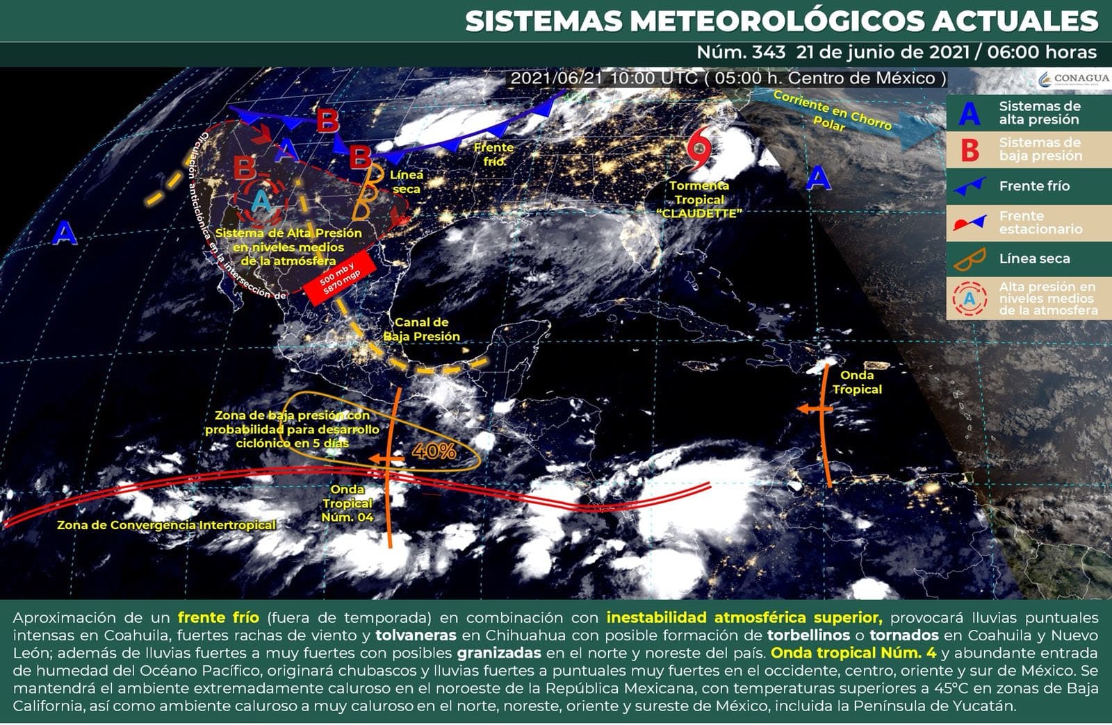 Este fenómeno provocará cielo nublado con lluvias puntuales muy fuertes con descargas eléctricas y posible caída de granizo y bancos de niebla en zonas montañosas de la región.
