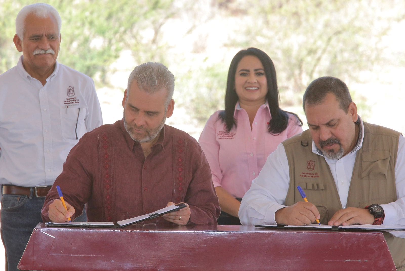 Acompañaron al gobernador Gladyz Butanda Macías, secretaria de Desarrollo Urbano y Movilidad; Cuauhtémoc Ramírez Romero, secretario de Agricultura y Desarrollo Rural; Vicente Estrada Torres, presidente del Consejo Estatal de Ecología; Abraham Rosas Olivo, presidente del Comisariado Ejidal de Joyas de la Huerta; Carlos Alberto García Salgado, representante de la Secretaría de Medio Ambiente y Recursos Naturales en el Estado de Michoacán; Jesús Camacho Pérez, delegado de la Comisión Nacional del Agua en el Estado; así como funcionarios estatales, municipales, ejidatarios y propietarios de bosque.