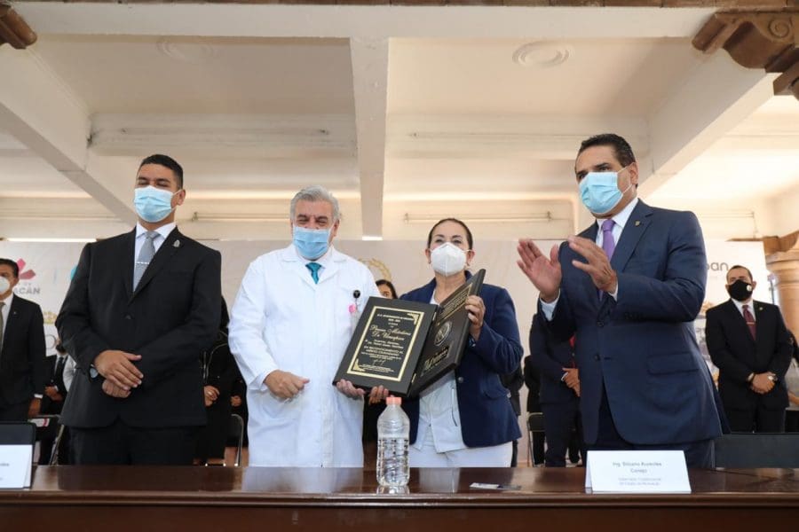 Uruapan, Michoacán.- Por su incansable lucha en la primera línea de batalla contra el COVID-19, personal de la Secretaría de Salud, IMSS e ISSSTE recibieron la Presea Mártires de Uruapan.