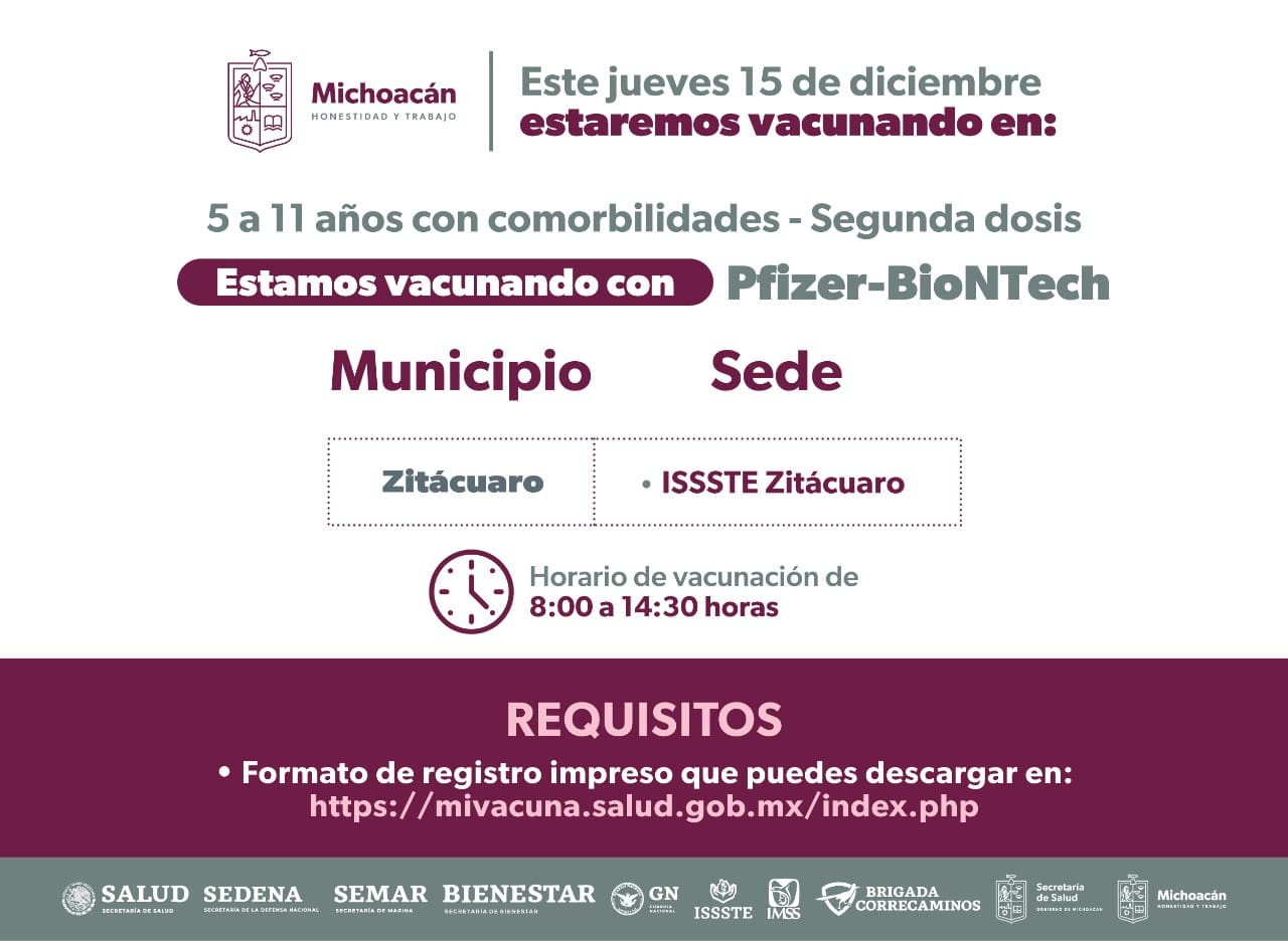 Morelia, Michoacán, 11 de diciembre del 2022.- Del 13 al 16 de diciembre, se estarán aplicando segundas dosis de vacuna contra COVID-19 e inmunizando a niños con comorbilidades de 5 a 11 años, en 18 municipios.
