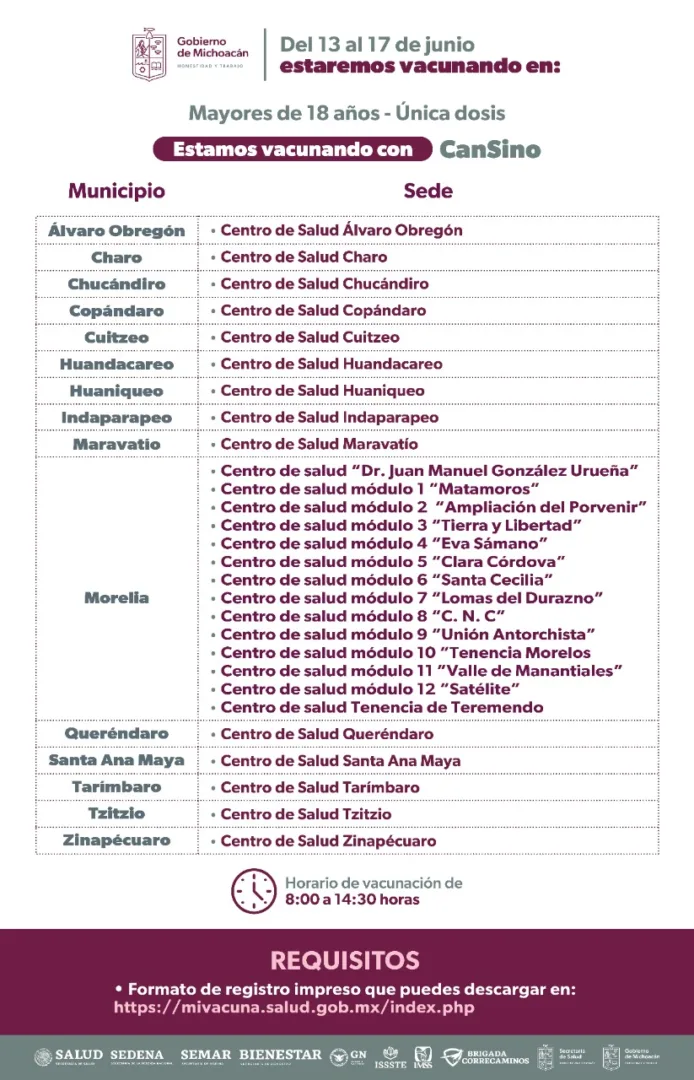 Los centros de salud de la tenencia Morelos y Teremendo, también estarán operando del 13 al 17 de junio, en un horario de 8:00 a 14:30 horas y el único requisito es llevar el formato impreso que puede descargarse de la siguiente pagina https://mivacuna.salud.gob.mx/index.php.