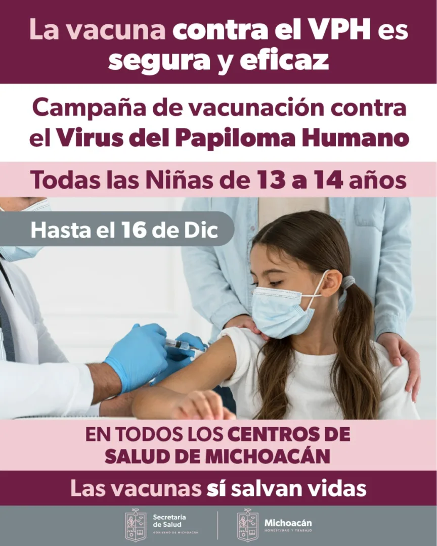 El único requisito es tener entre 13 y 14 años cumplidos, acudir con el CURP impreso y solicitar la vacuna, la cual es altamente segura, pues su eficiencia es revisada periódicamente desde que se autorizó su comercialización en 2006 y su aplicación en Michoacán en 2010; además que reduce el riesgo de contraer cáncer cérvico uterino.