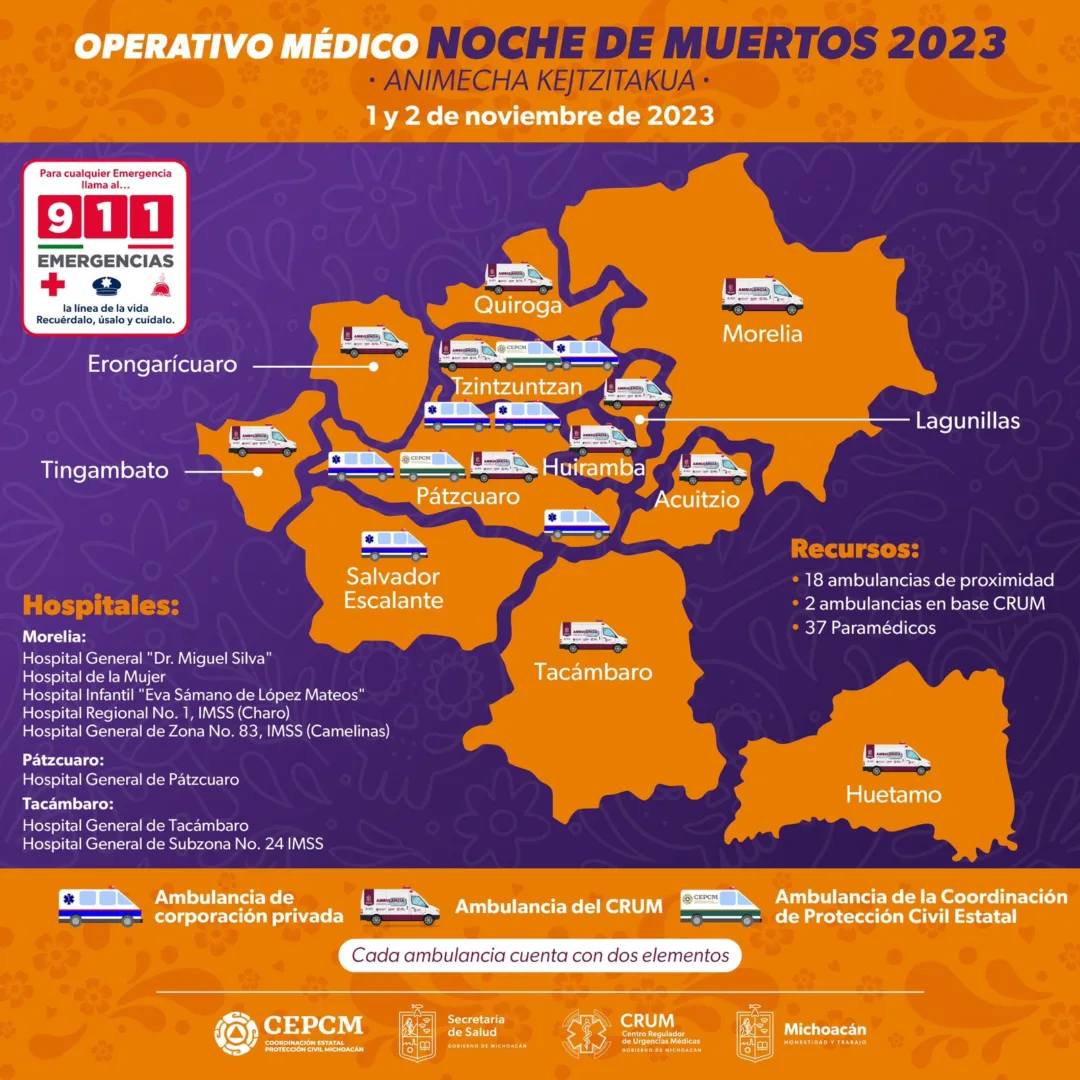 A través del Centro Regulador de Urgencias Médicas (CRUM), mantendrá un operativo médico prehospitalario en los municipios de Quiroga, Pátzcuaro, Morelia, Lagunillas, Acuitzio, Tacámbaro, Salvador Escalante, Tingambato, Erongarícuaro, Huiramba, Tzintzuntzan y Huetamo, con la presencia de 37 paramédicos.