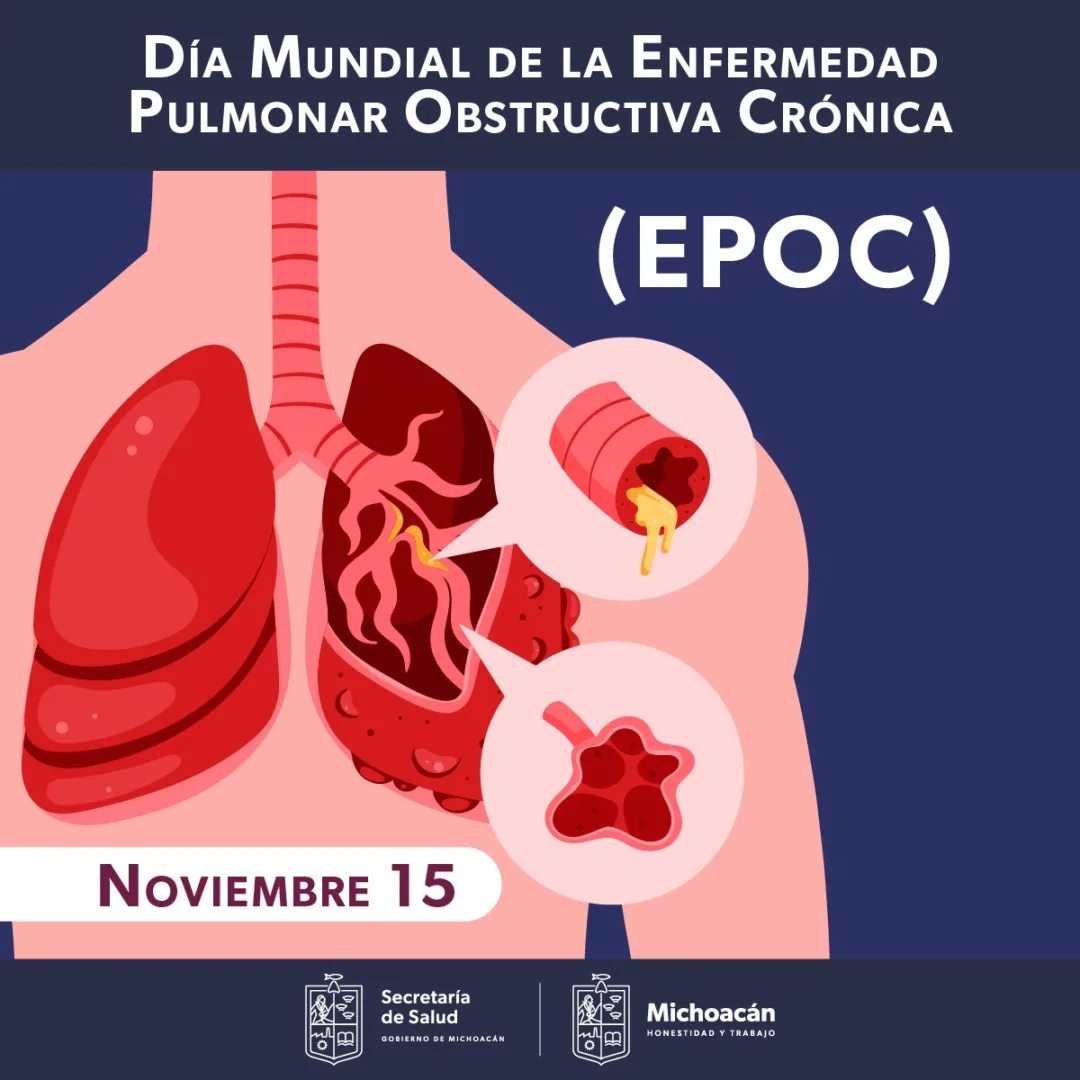 Morelia, Michoacán, 15 de noviembre de 2023.- Bajo el lema “Respirar es vida: actúa antes”, la Secretaría de Salud de Michoacán (SSM) conmemora el Día Mundial de la Enfermedad Pulmonar Obstructiva Crónica (EPOC), con una campaña de información en los centros de salud de la entidad, donde invita a la población a detectar a tiempo los signos de alarma, como dificultad para respirar y sensación de cansancio, tos crónica, así como exacerbaciones frecuentes, es decir episodios intensos de tos y expectoraciones (mucosidades), que pueden durar de días a semanas.
