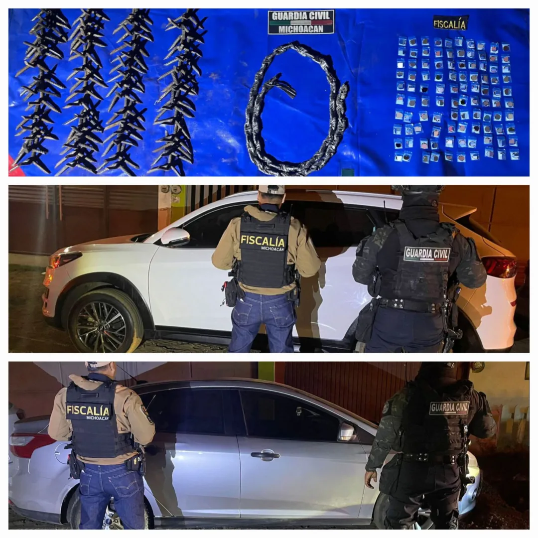 Uruapan, Michoacán, 13 de abril del 2023.- Los trabajos coordinados de la Secretaría de Seguridad Pública (SSP), junto a personal de la Fiscalía General del Estado (FGE), permitieron el aseguramiento de dos hombres junto a varias dosis de droga, dos vehículos con alteraciones en sus medios de identificación, poncha llantas y una cadena envuelta en cinta color gris.