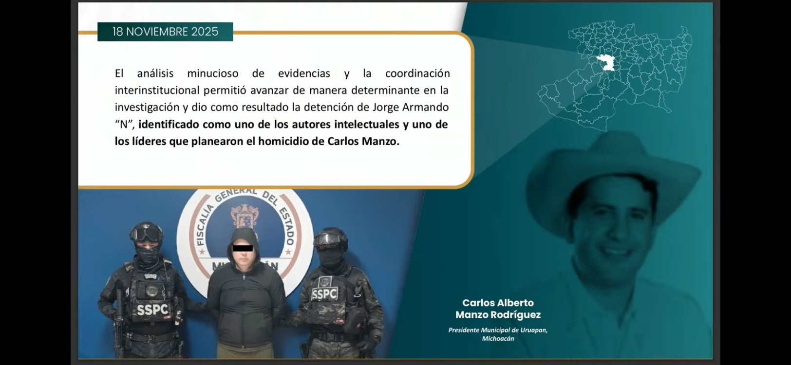 El Gabinete de Seguridad del Gobierno Federal informó este miércoles sobre la detención de Jorge Armando “N”, identificado por las autoridades como uno de los presuntos autores intelectuales del homicidio de Carlos Manzo, quien fuera presidente municipal de Uruapan, Michoacán.