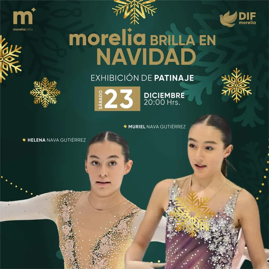 Morelia, Michoacán; 21 de diciembre de 2023.- Este sábado 23 de diciembre, la Pista de Hielo de Morelia, una iniciativa de la Presidenta Honoraria del DIF Morelia, Paola Delgadillo Hernández, se engalanará con una espectacular exhibición de patinaje artístico por parte de Helena y Muriel Nava Gutiérrez, dos jóvenes promesas del patinaje a nivel nacional, en la que demostrarán su talento y habilidad sobre el hielo.