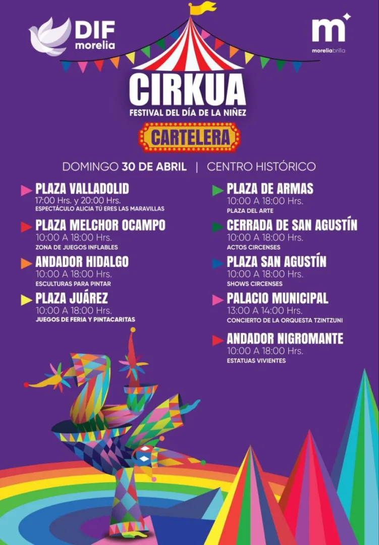 De esta forma, apartir de las 10:00 horas, las distintas plazas y espacios públicos del Centro Histórico de Morelia acogerán espectáculos circenses, actos de magia y acrobacias, show de payasos, juegos de feria e inflables gigantes.