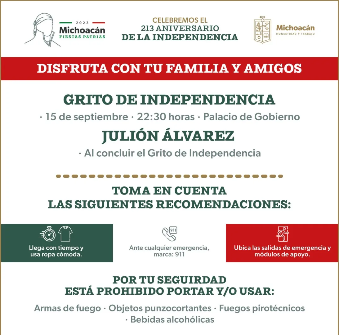 Morelia, Michoacán, 15 de septiembre de 2023.- El Gobierno de Michoacán invita a la población a disfrutar en familia y amigos, la celebración del Grito, con motivo del 213 aniversario del inicio de la Independencia, así como del concierto gratuito que ofrecerá Julión Álvarez en el Centro Histórico de la capital michoacana.