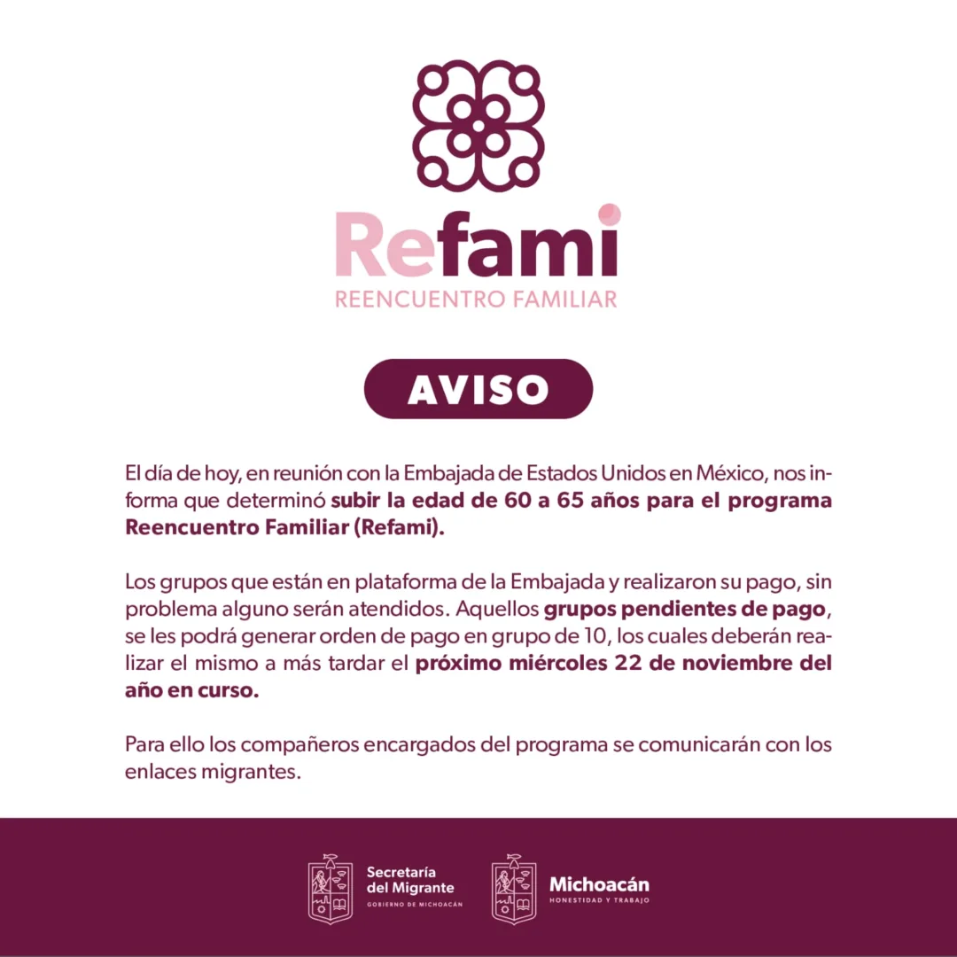 Morelia, Michoacán, 19 de noviembre de 2023.- Por instrucción de la Embajada de Estados Unidos en México, se determinó subir la edad de 60 a 65 años para iniciar el trámite de la visa de turista para el programa Reencuentro Familiar (Refami), informó la titular de la Secretaría del Migrante (Semigrante), María Teresa Mora Covarrubias.