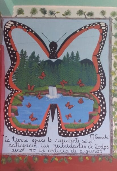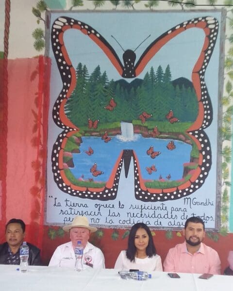Tras lo cual, se procedió a la develación del mural, donde en la parte central aparece la figura de Emiliana Zapata Salazar, precursor del agrarismo en el país y un paisaje de Zitácuaro, en el que resaltan los cerros Cacique y Pelón. En el parte izquierda, viéndolo de frente aparecen los nombres de quienes fueron gestores y por ende, los fundadores del ejido, mientras que en la parte derecha aparece la Mariposa Monarca, que viene a los bosques del municipio y que se le ve por varios rumbos, como ocurre en la tenencia de Chichimequillas de Escobedo.