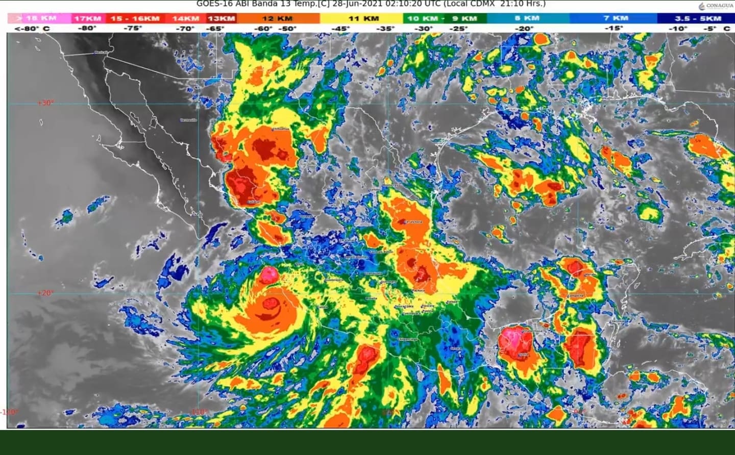 Se ha emitido alerta naranja para el sur de Nayarit y el noroeste y suroeste de Jalisco, así como alerta amarilla para el sur y oeste de Colima, el centro y este de Nayarit y el centro, sur y sureste Jalisco.