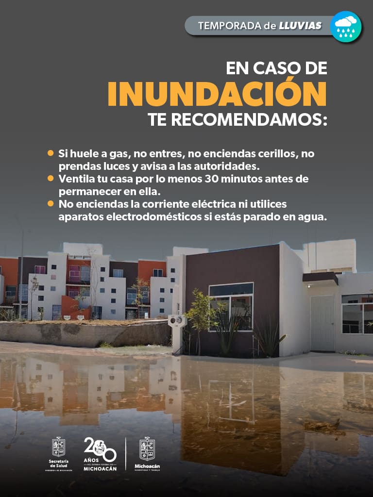 Morelia, Michoacán, 17 de julio de 2024.- Tras la tromba registrada esta tarde en Morelia, la Secretaría de Salud de Michoacán (SSM) emite las siguientes recomendaciones en caso de inundación en tu vivienda.