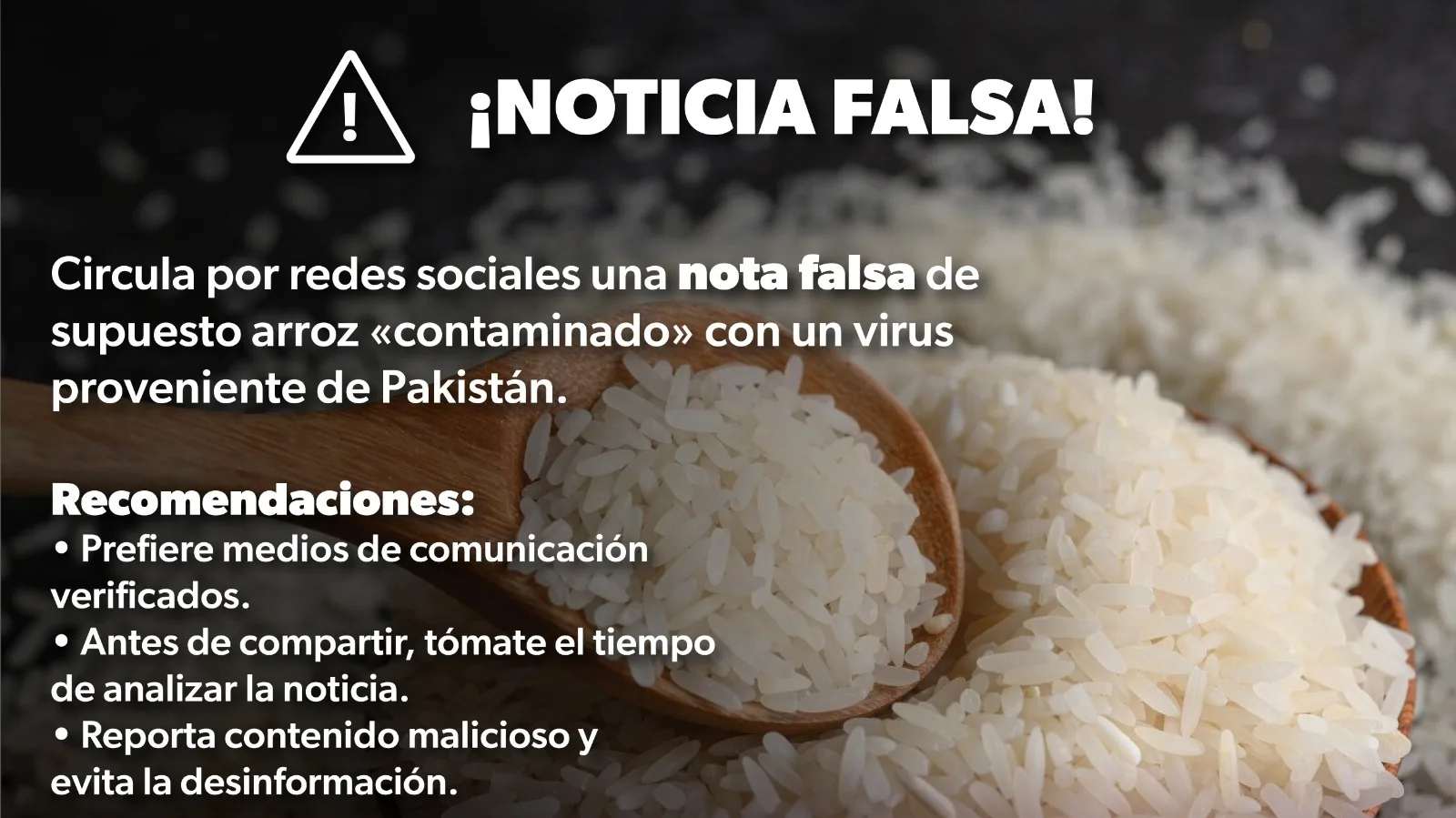 En las labores de ciberpatrullaje, se detectó una cadena que circula en redes sociales y WhatsApp, sobre un mensaje que asegura que llegó al país un cargamento de arroz contaminado con un virus proveniente de Pakistán.