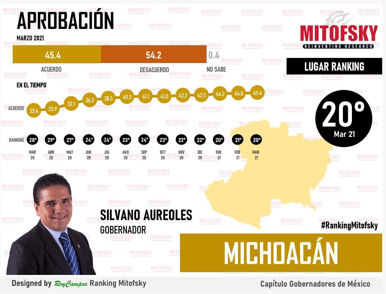 El histórico de la encuesta destaca que en marzo de 2020 la aprobación del mandatario era de 23.4 por ciento, mientras que los informes de Mitosfky establecen que el crecimiento anual de Silvano Aureoles está relacionado con las medidas que adoptó para contener la ola de contagios de COVID-19 en su estado.