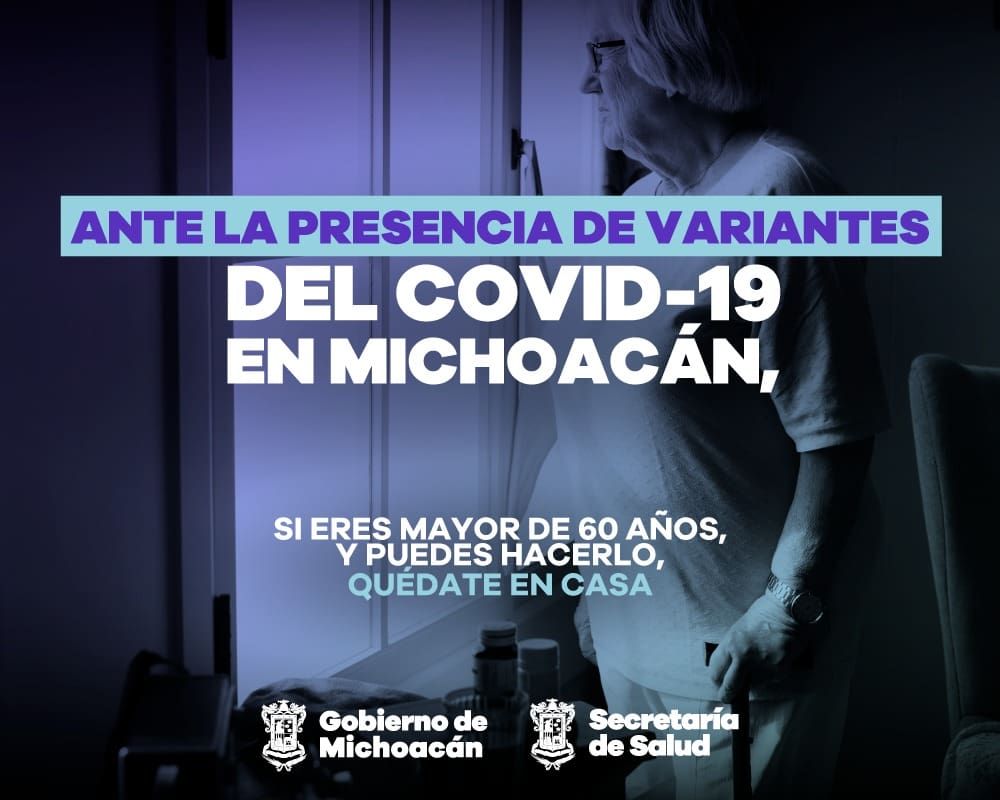Morelia, Michoacán, a 2 de junio de 2021.- Debido al riesgo que representa para los adultos mayores, el Gobierno de Michoacán puso en marcha una campaña de protección a este sector poblacional ante el riesgo que representa la confirmación de una nueva variante de COVID-19 con presencia en nuestro Estado, llamada “de la India”.