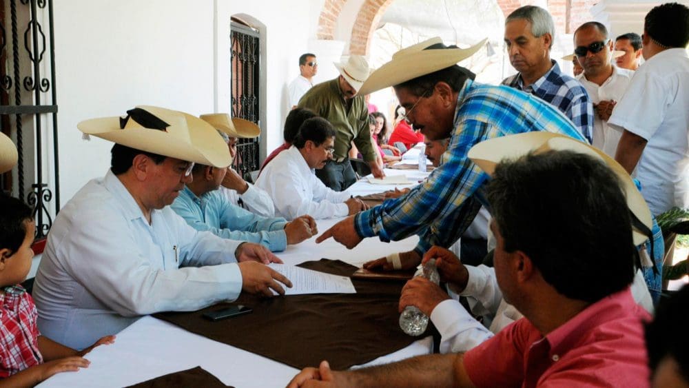 Durante un encuentro en el casco de la ex hacienda con habitantes del municipio, quienes presentaron solicitudes para la atención de diversos asuntos, el gobernador Reyna García entregó un tractor tipo oruga para el mejoramiento de caminos en el territorio municipal, en beneficio de productores rurales y la comunidad en general.