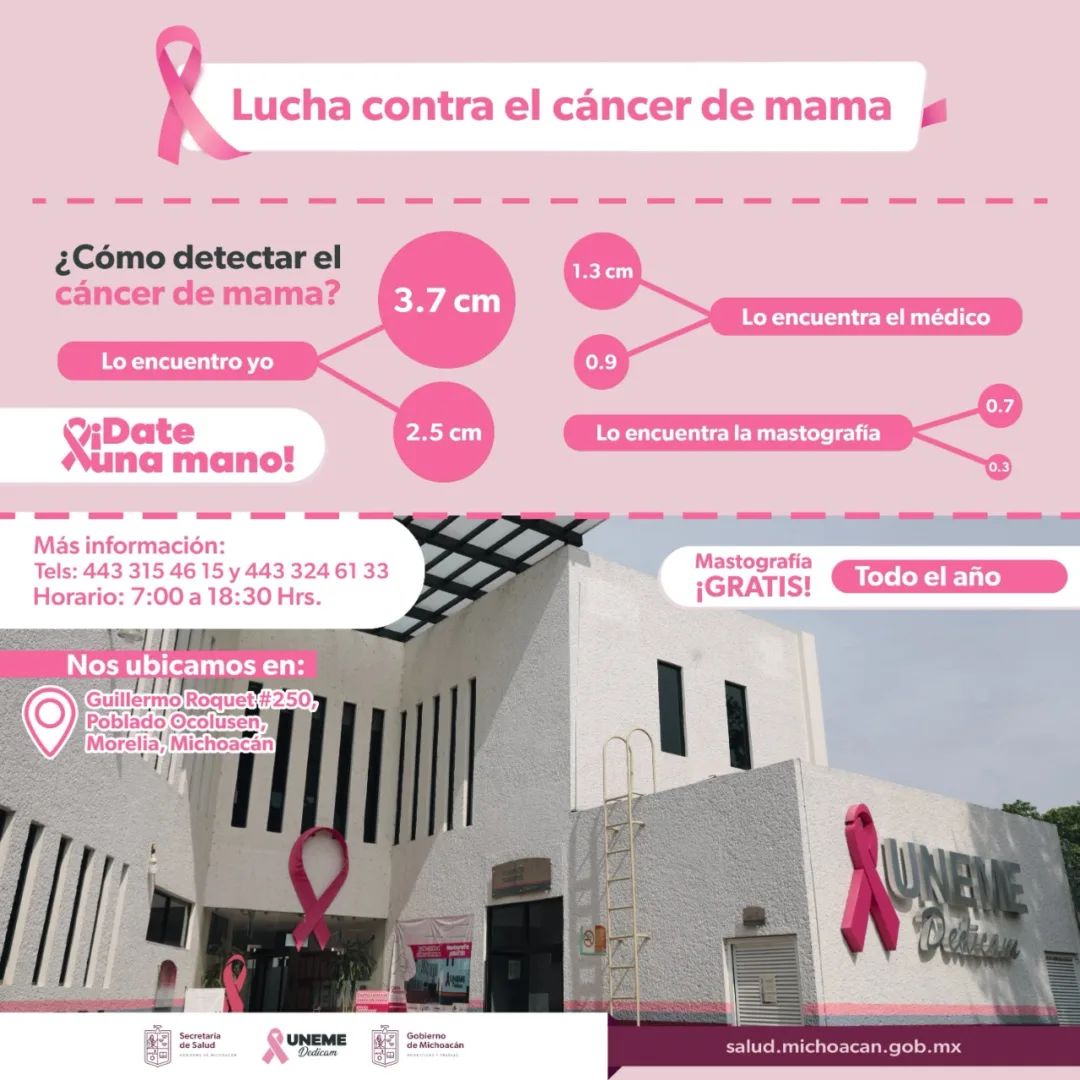 En la Uneme Dedicam se puede realizar una cita gratuita para practicarse la mastografía a los teléfonos 4433246133 y al 4433154616, o bien acudiendo a las instalaciones ubicadas en Guillermo Roquet #250, a un costado del Hospital de la Mujer en Morelia.