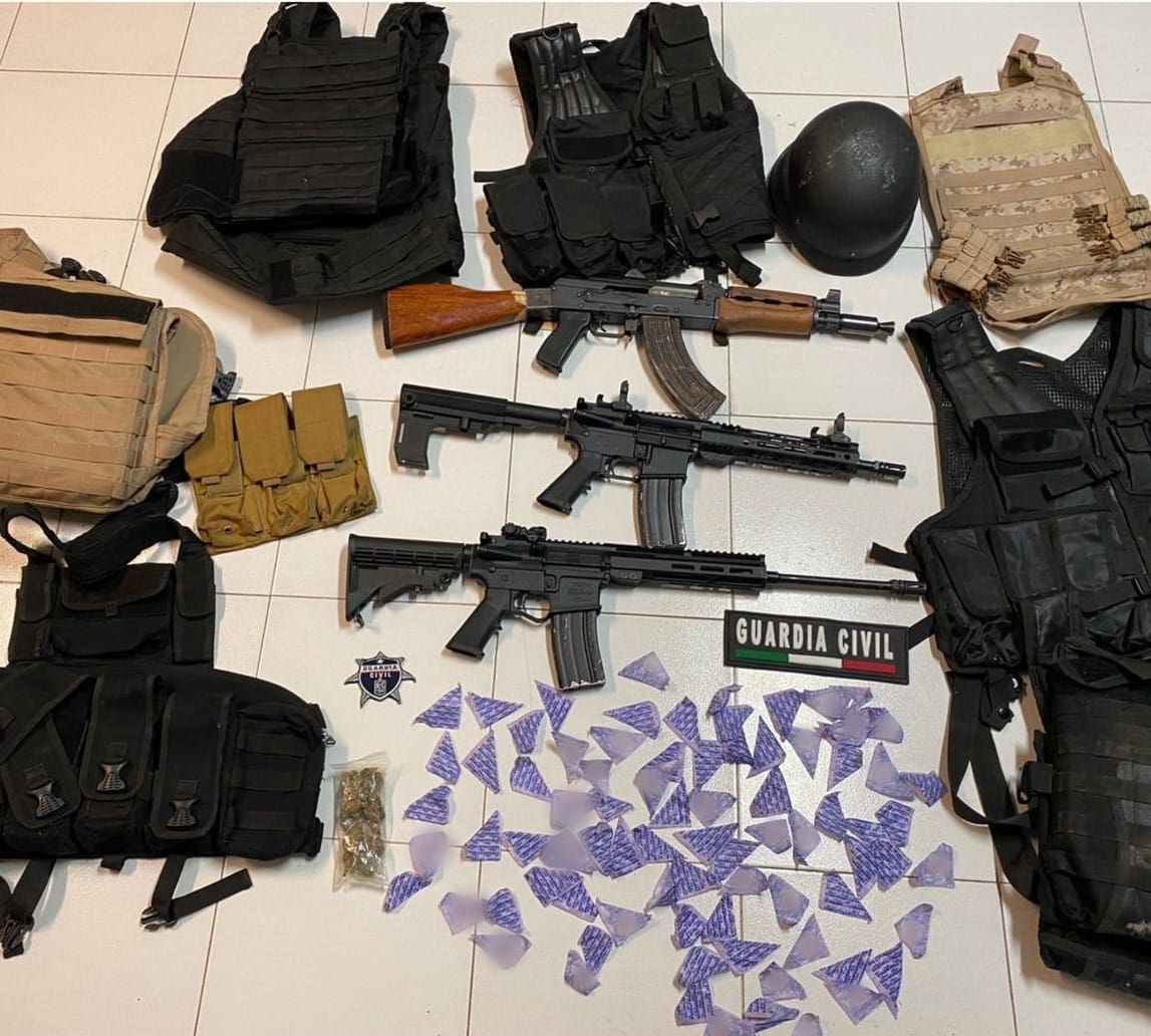 •Dentro de la unidad fueron encontradas tres armas largas, seis chalecos y un casco balísticos, así como 81 sobres de aparente enervante.
