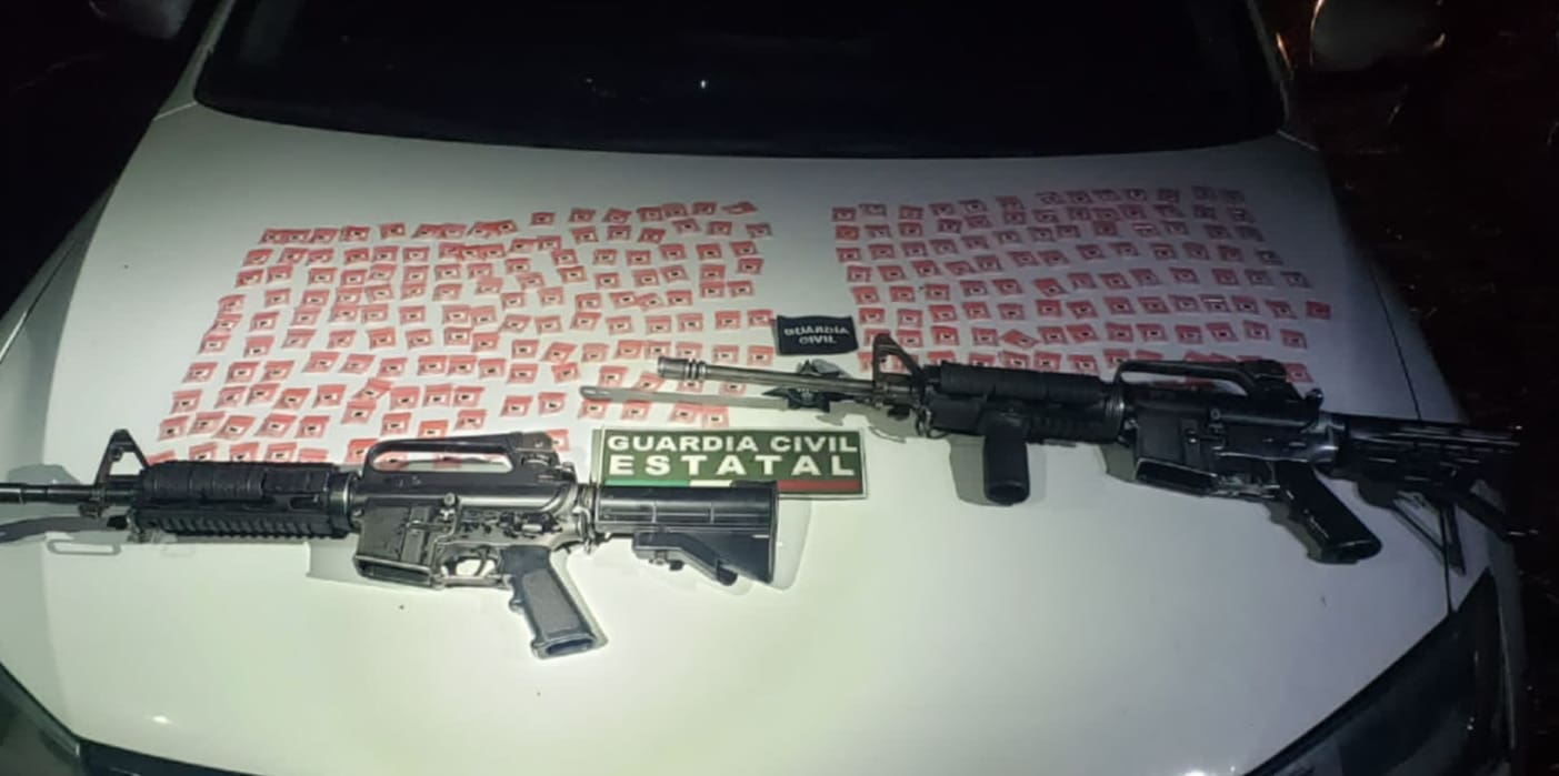 Posteriormente, los efectivos procedieron a una inspección a la unidad: localizaron en su interior 267 envoltorios con la droga conocida como metanfetamina, así como dos armas de fuego largas, calibres 5.66 mm y .223, respectivamente. En el lugar, no se encontraban casquillos ni personas lesionadas.