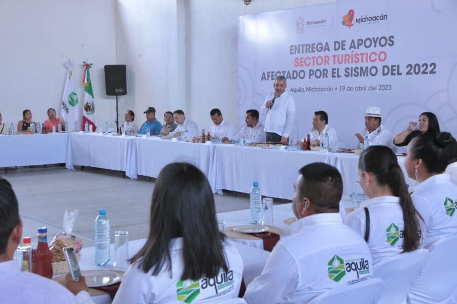 Aquila, Michoacán, 19 de abril de 2023.- De forma histórica, prestadores de servicios turísticos de Aquila y Coahuayana recibieron del gobernador Alfredo Ramírez Bedolla, apoyos a fondo perdido que ascienden a los 8.7 millones de pesos para sus enramadas, hoteles y restaurantes.